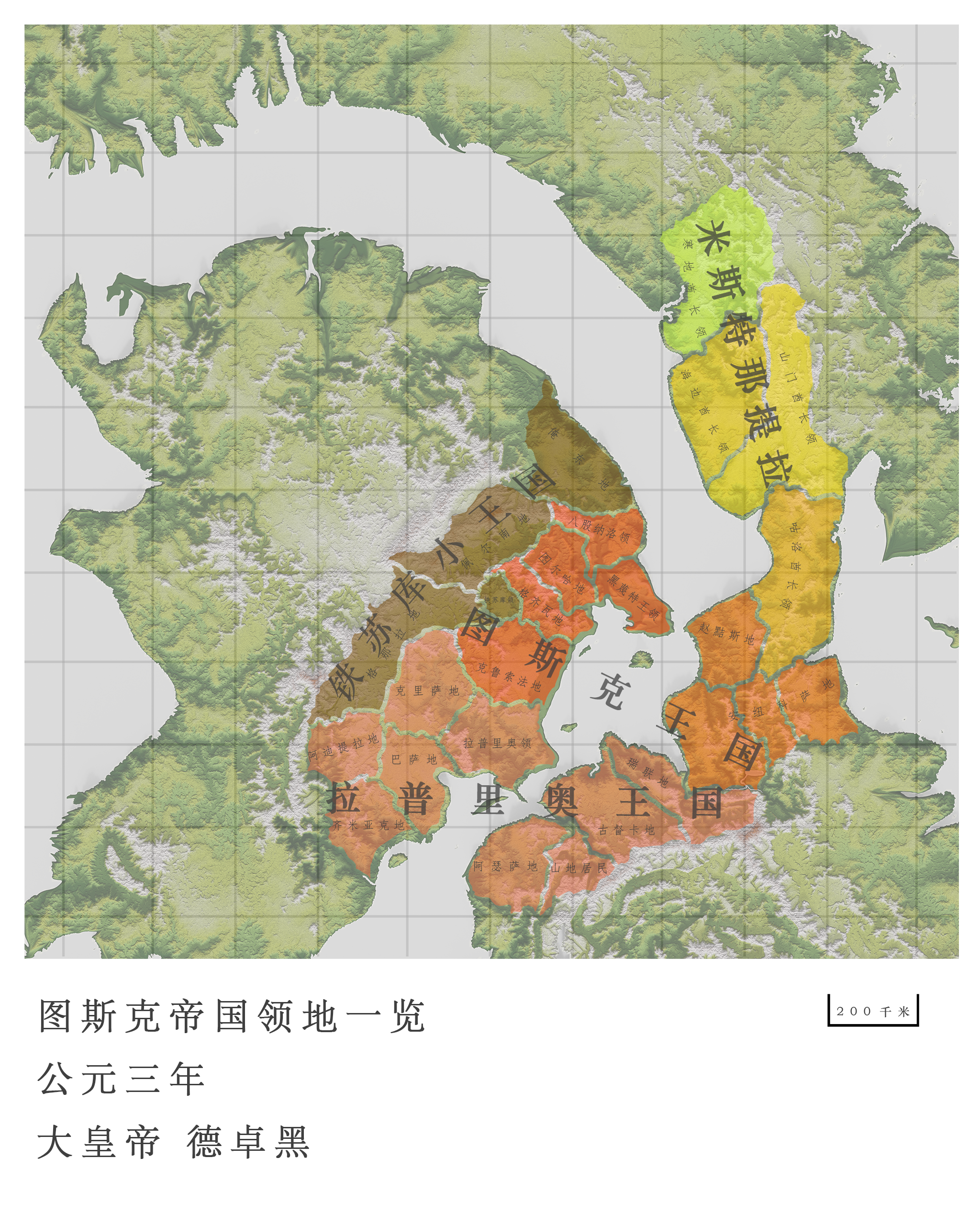 图斯克帝国,主要由三个大块组成,即咕洛诸部,也称北王国,主要由北方的游牧民族咕洛族各部领地构成; 图斯克地区,是帝国的核心领地,也称中央王国,后来又被分做黑蔑特和铁苏库两个王国;拉普里奥,也称南王国,“诺瓦亚”在古拉普里奥语中是“海边”的意思。